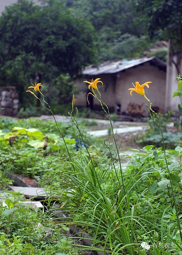 萱草:一种百合科植物,与黄花菜同属,但花为桔黄色,种植于附近农家门口。