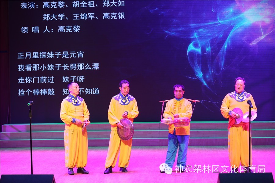 当晚,能容纳300余名观众的神农架群艺馆座无虚席。农民艺人们身着特色民俗服装,手持花鼓,锣,钹、马锣、喇叭等民族乐器,吹打弹唱,现场表演精彩纷呈。