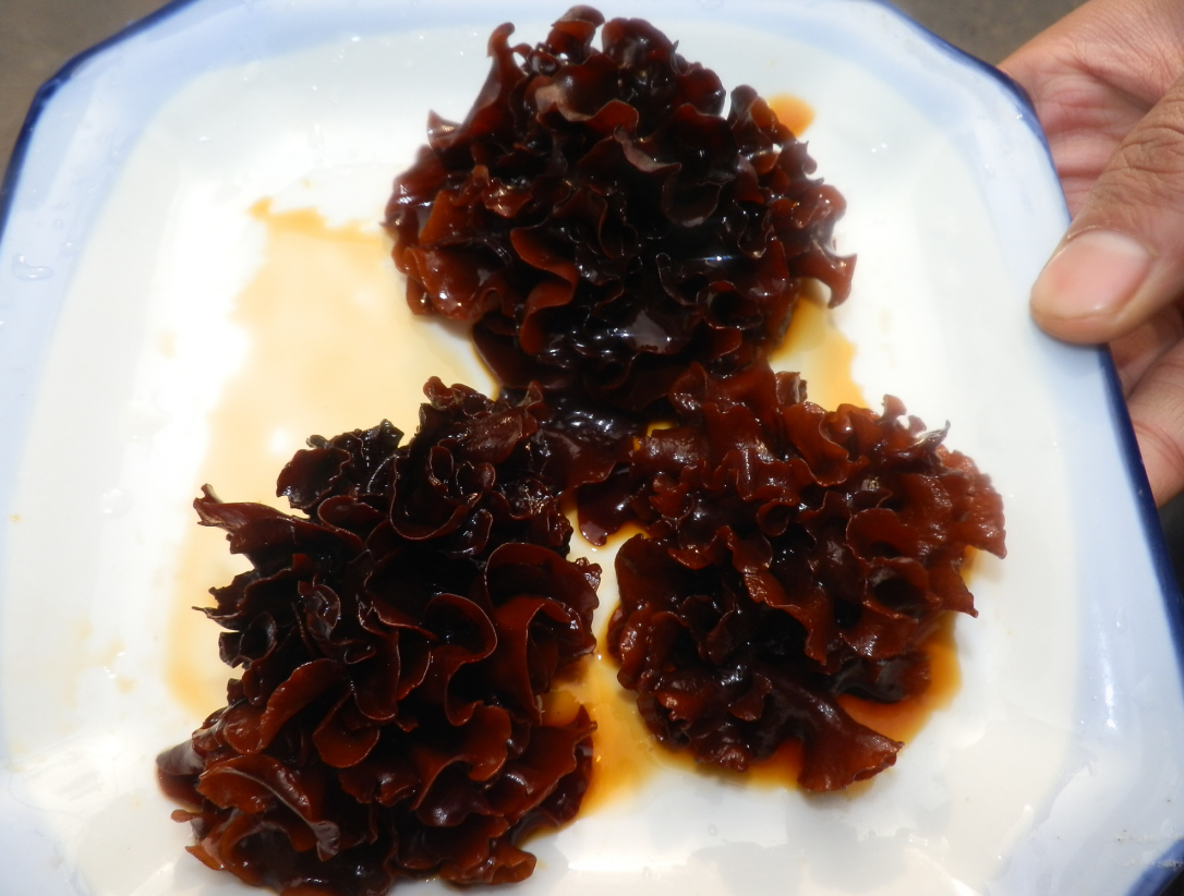 据介绍,这种血耳相当珍稀,必须在海拔2000米以上、常年有雾的高山上才有可能长出。更苛刻的是,全国目前唯一只有神农架地区有纯野生的血耳。其它地区,比如十堰都,也只能栽培出仿野生种植的血耳。所以在一般市场上,血耳非常难得,价钱也比普通木耳高几倍。