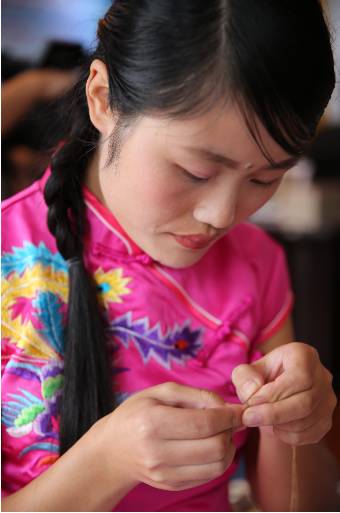“堂纺叠绣”,大多使用绸缎面料,一般要在一个图案上将丝线最低叠绣三层,多者叠绣六七层,使图案赋予立体感,让其栩栩如生。