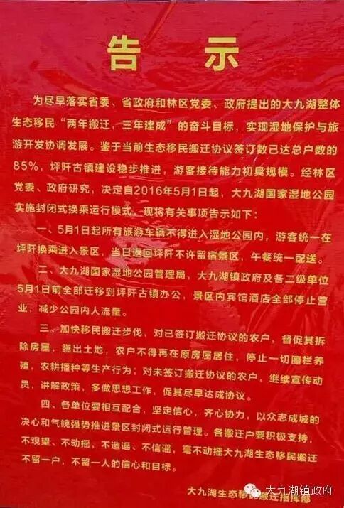为尽早落实省委、省政府和林区党委、政府提出的大九湖整体生态移民“两年搬迁,三年建成”的奋斗目标,实现湿地保护与旅游开发协调发展。经林区党委、政府研究,决定自2016年5月1日起,大九湖国家湿地公园实施封闭式换乘运行模式,现将有关事项告示如下: