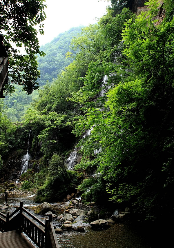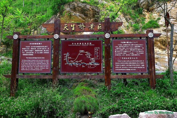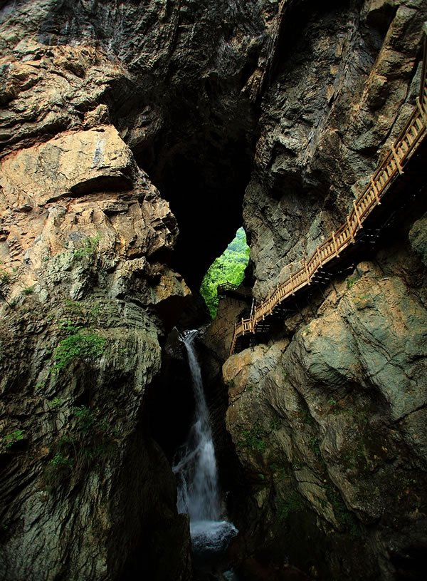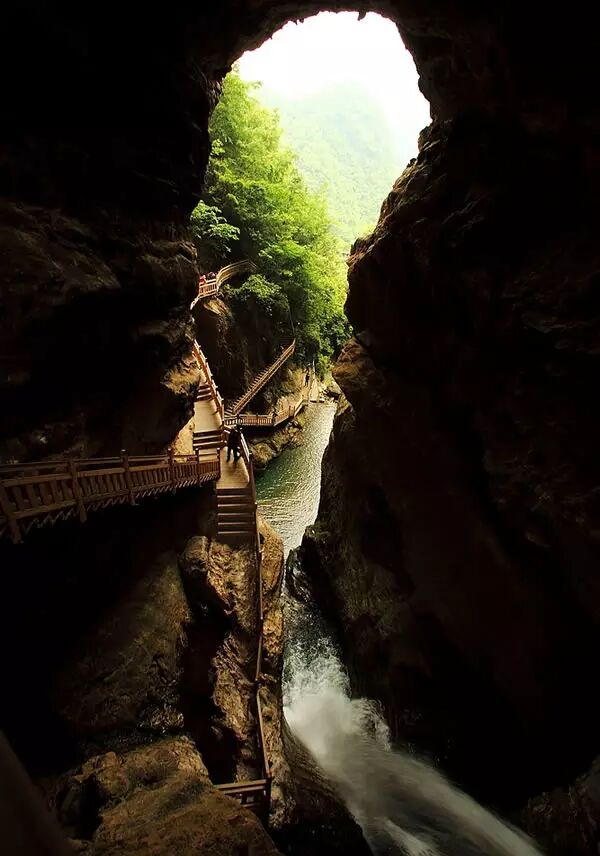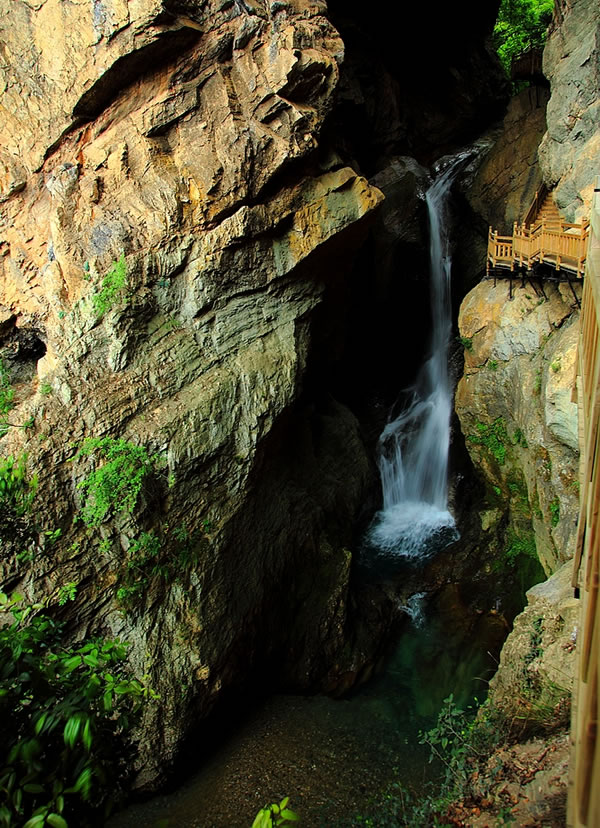 天生桥瀑布的险峻奇让我们叹为观止。山中有洞,洞里有河,河自云中落。天生桥是一个可以对穿望见许多山峰的明洞,神奇的明洞里居然奔流着一条小河,河水湍急地冲过涯口便跌落为瀑;地势险峻难仰其高,声音轰鸣不绝于耳,点点飞珠溅玉碎在栈道上,时有银河将倾之叹,站在青山绿水边上,似乎自己也成了仙人,聆听着訇然作响的瀑声,只觉得迎面而来的是点点雾气,如蒙蒙细雨,似点点飞雪,挟来大自然生生不息的活力,回荡着大自然纯正清脆的音响,飞瀑流淌出的是一幅掩映在绿树怀抱中的天然动感画卷。