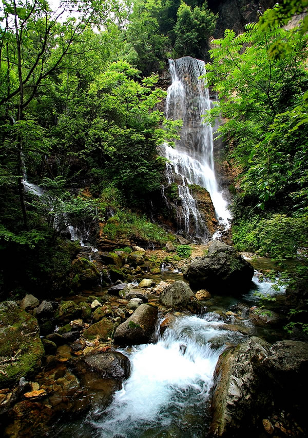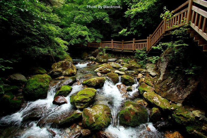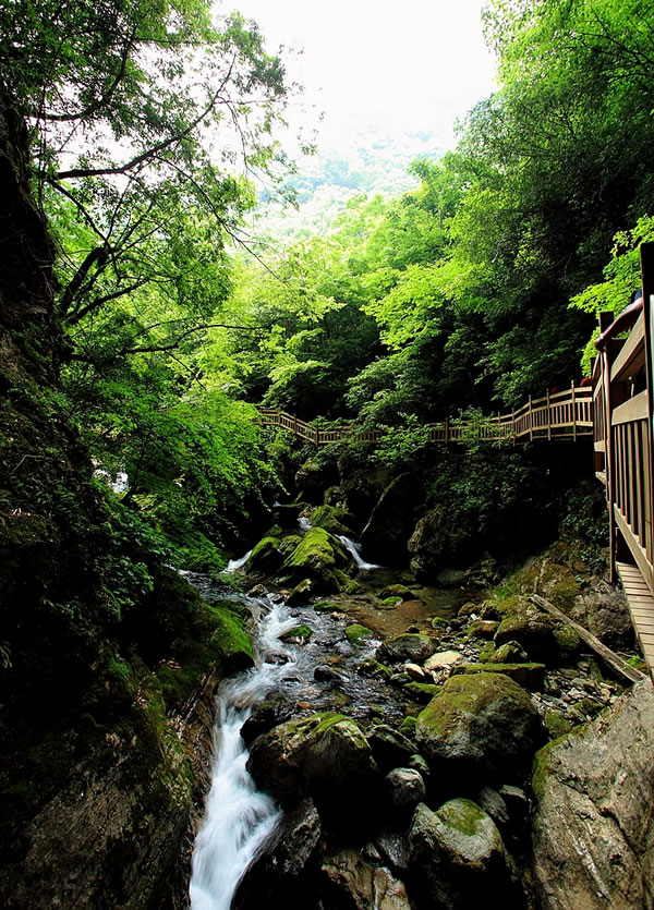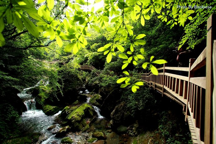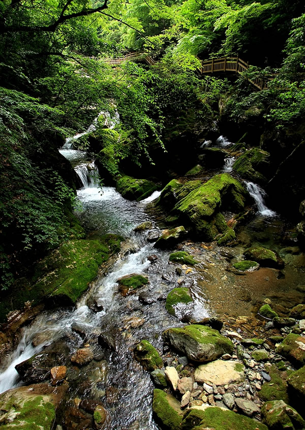 神农架的飞瀑水景很美,有的韵味在于幽静,几叠水帘似乎跌破了丛林疏影的网罗,悄然穿过了绿叶的扶疏,滋来润湿清香的林风,袭人于顿时的惬意。时分时合,迂回曲折,于参天古木间,花草掩映,百鸟低徊,多的是几分娇媚。而有的则是高悬于峡谷之上的一瀑飞落,出于林亦隐入林,一抹银白悬在山腰间分外夺眼。山凭水凝翠,水隐山生幽,绿莹莹的清凉世界里有花木郁郁,跌水踪踪,一抬头头顶上是青山绿水间的斑斓的绿色万花筒。如此这般景致,让人突然地便远离了城市的喧嚣,找到一片属于内心自由静美的绿洲,感受到古人推崇的天人合一与道法自然的魅力。