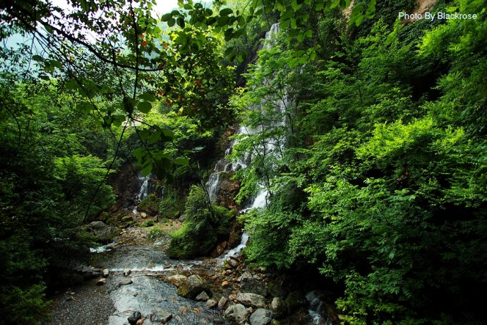 此桥是观音桥,前面的是羊潭,后面的是虎潭。之所以称为观音桥,是因为这里瀑布水流很急,造成了声音的轰鸣与回响,汇成美妙之音乐,就连观音都流连忘返。