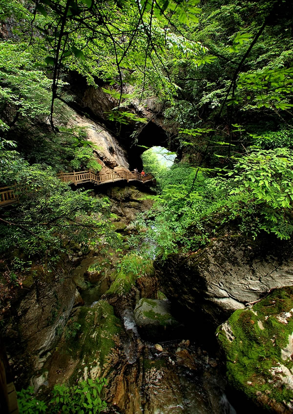 瀑声如雷,一桥飞架两山之间,气势恢弘;此桥由溪水天长日久冲刷自然形成而得名,集桥、瀑、潭、山、树于一体,置身其中,犹如“世外桃源”;