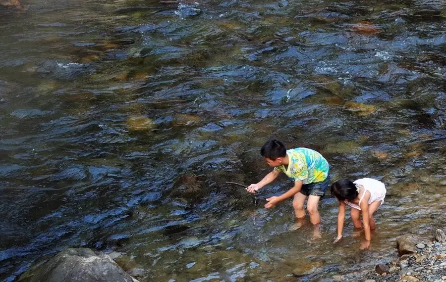 宋洛河滩上,有个电影《情天大圣》造的水泥恐龙,这个恐龙下了一排蛋,因恐龙内里是竹木结构,已经被山水切去一半。我们在这里停下来下水,体验宋洛河之水急,或者要下到水里去,我想象从前在索溪峪那样躺在河里看山峰和云,水旋即将我冲下四五米,我扒住一个卵石得以停留。然而,便是这样扒着一个卵石仰躺在宋洛河里,看山峰,看白云悠悠,激流擦身淌过,甚是凉爽惬意。往上走,有一个深水潭,许多人在那里垂钓,据说有杨条子鱼。午时,去宋洛乡,我不知道这里有什么奇异的美食。